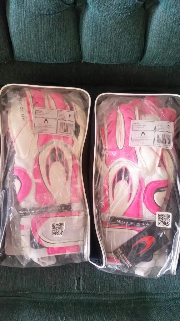 Guantes de portero marca HO SOCCER, color rosado con blanco, en talla 11 y talla 9, 25 mil colones cada uno.